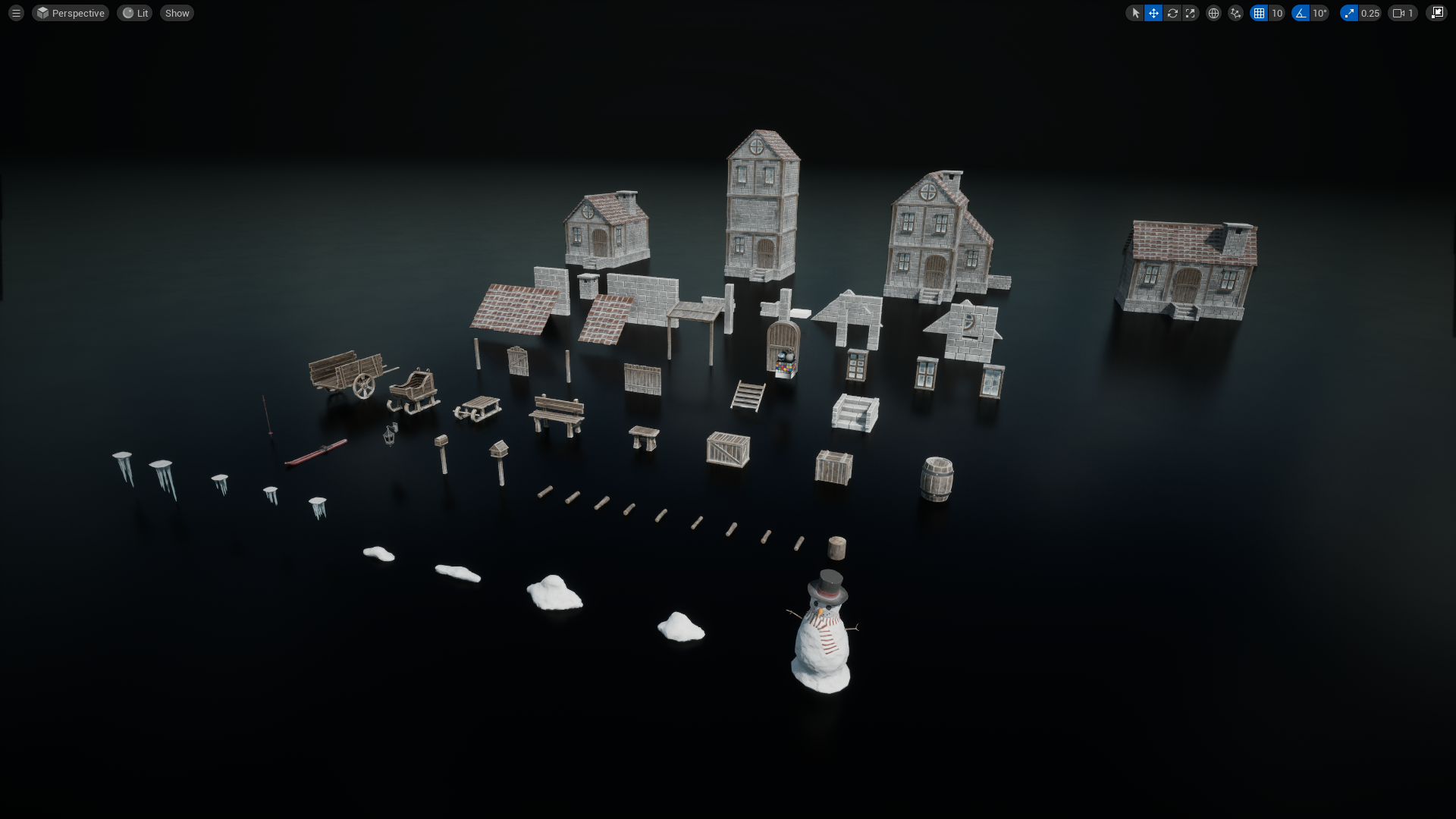 - Prop variety that supports multiple themes: storybook villages, medieval trading posts, alpine outposts, or festive event maps