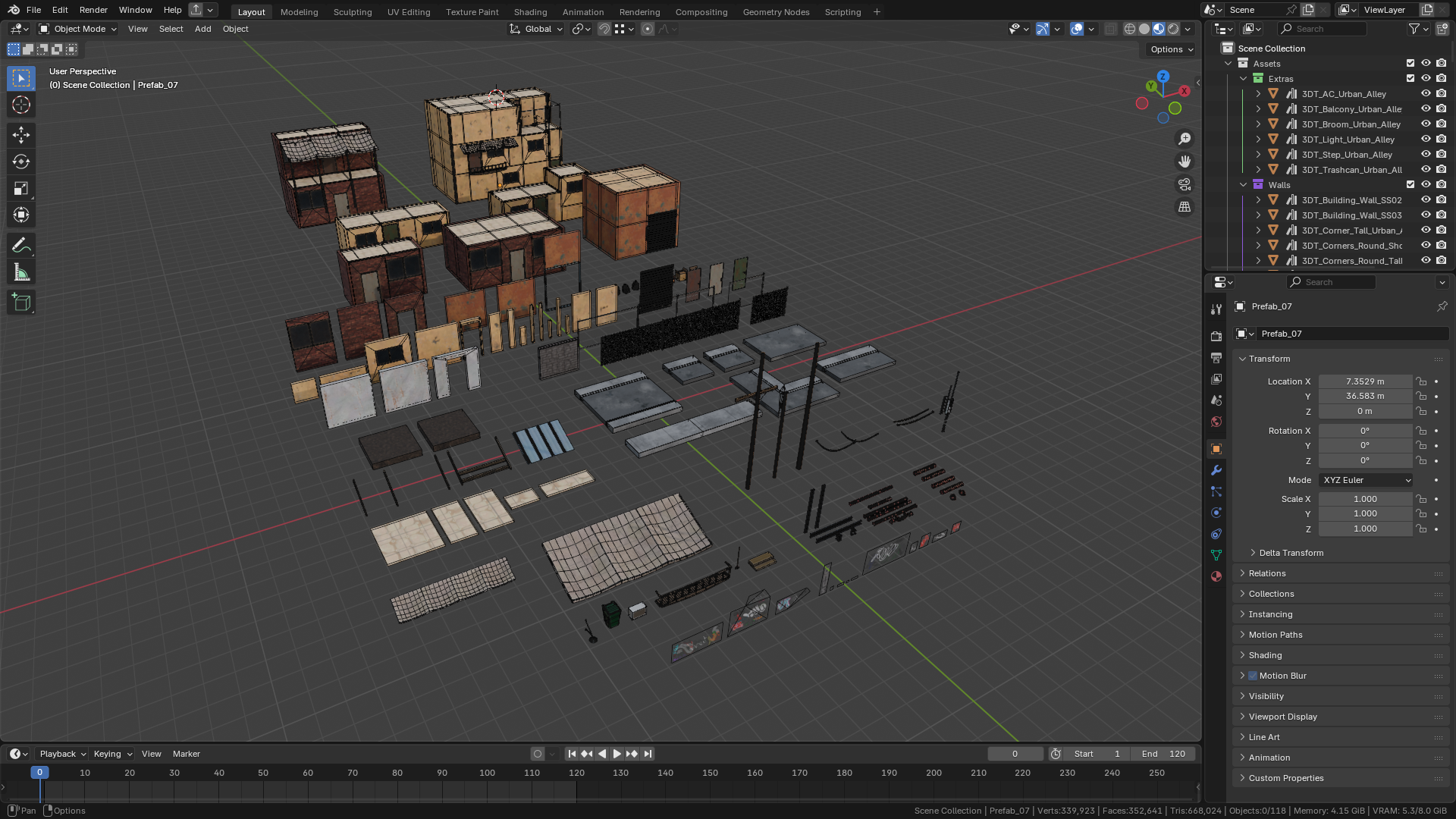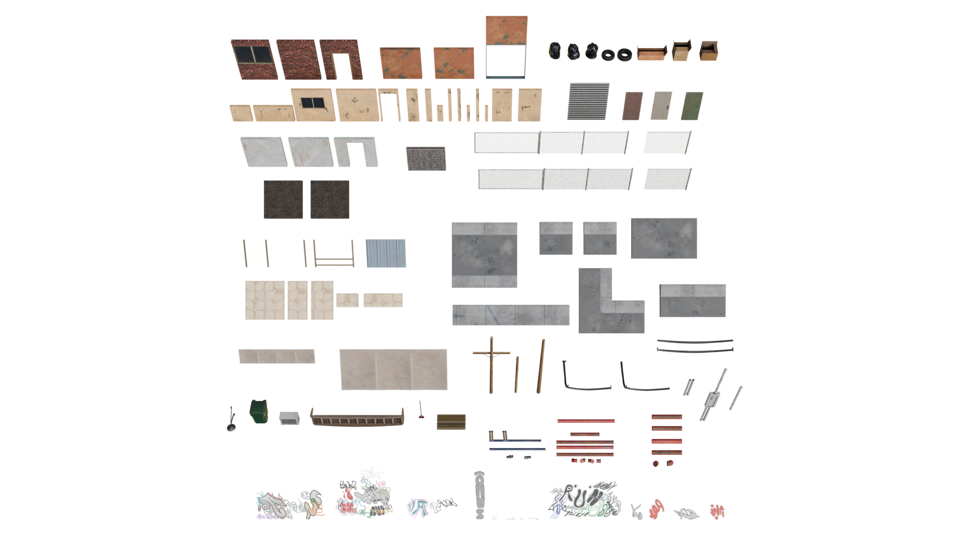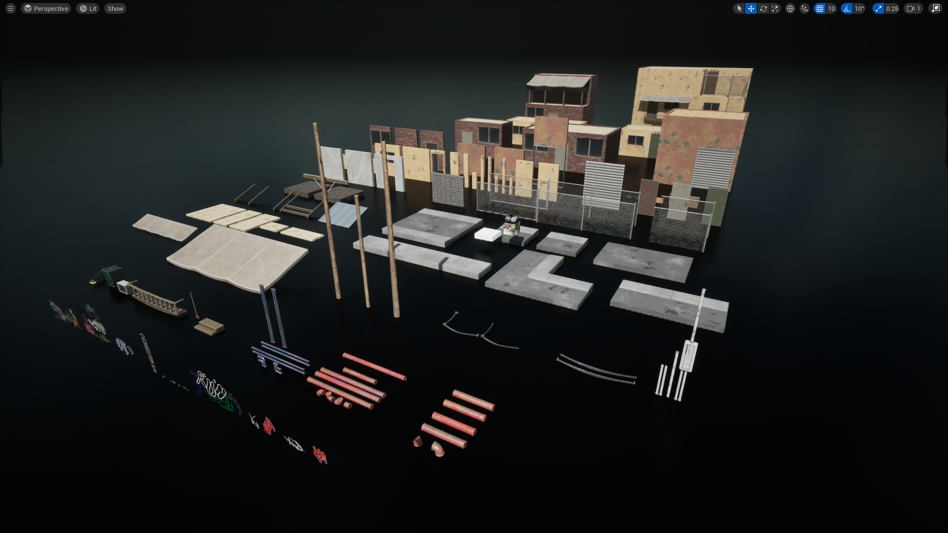 You get building parts, street props, graffiti decals, and pre-built prefabs tuned for stylized cinematic renders and optimized game environments.