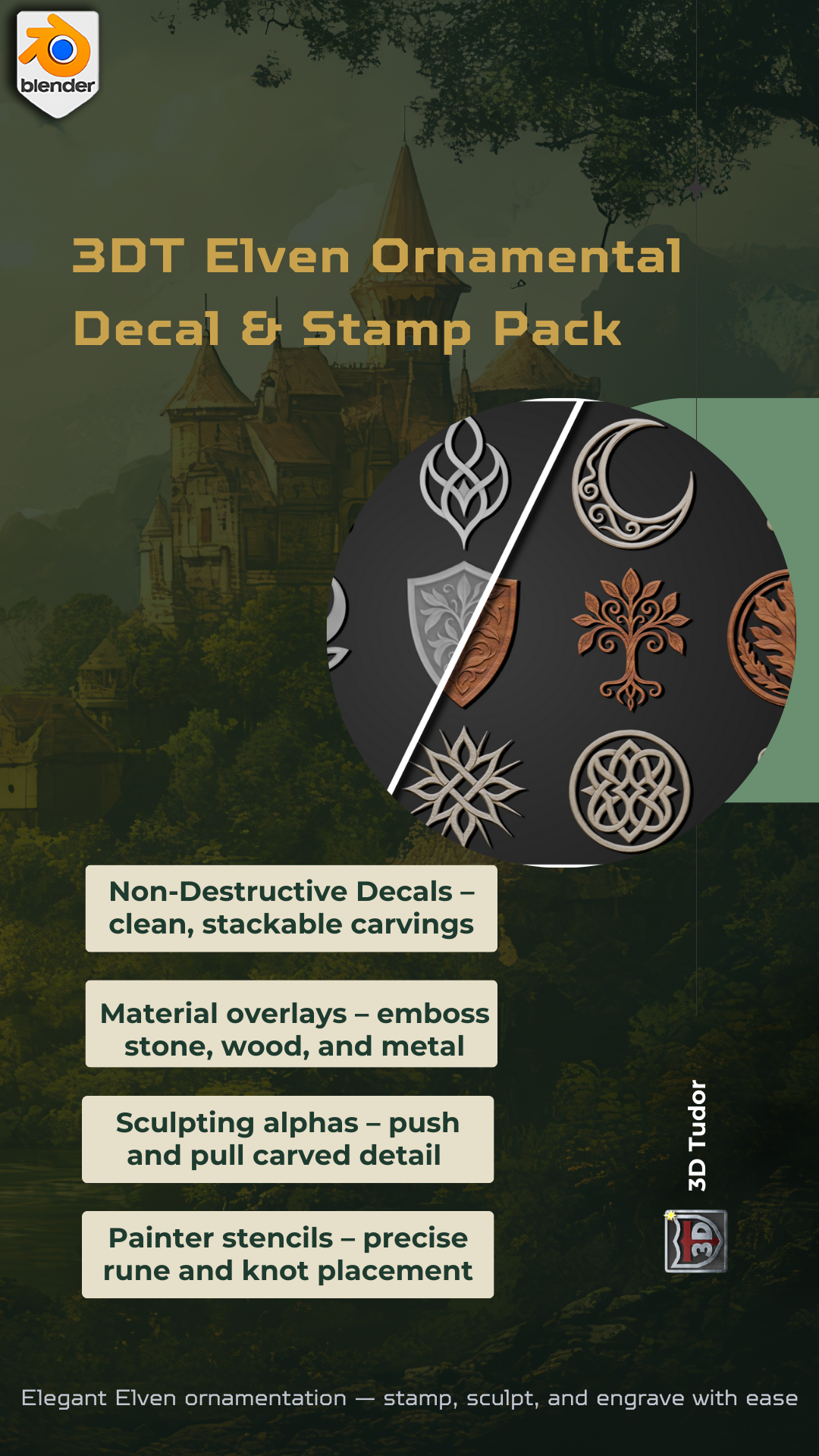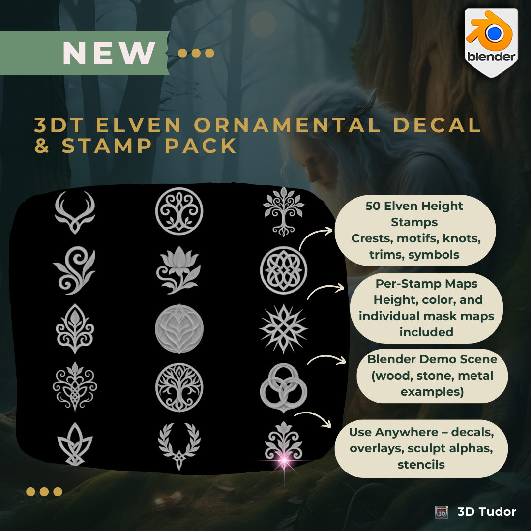 The 3DT Elven Ornamental Decal & Stamp Pack delivers 50 production-ready Elven designs with height, color, and masks — plus a Blender demo file so you can create immediately.
