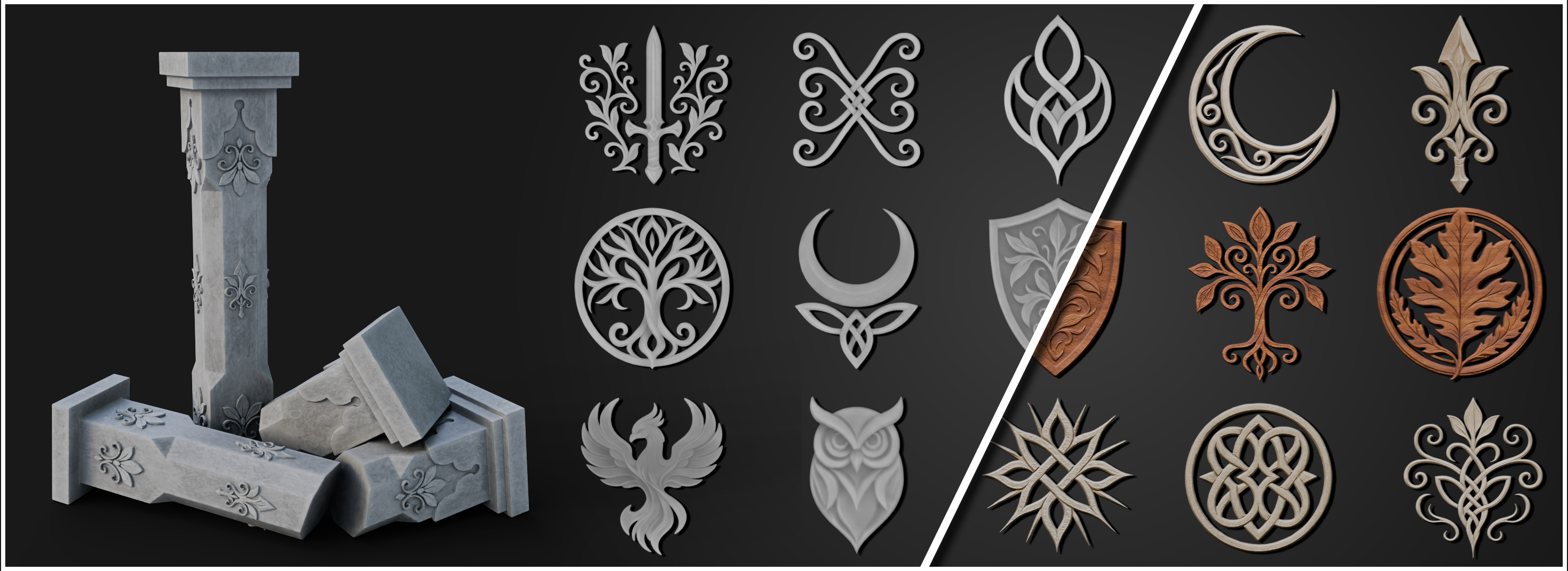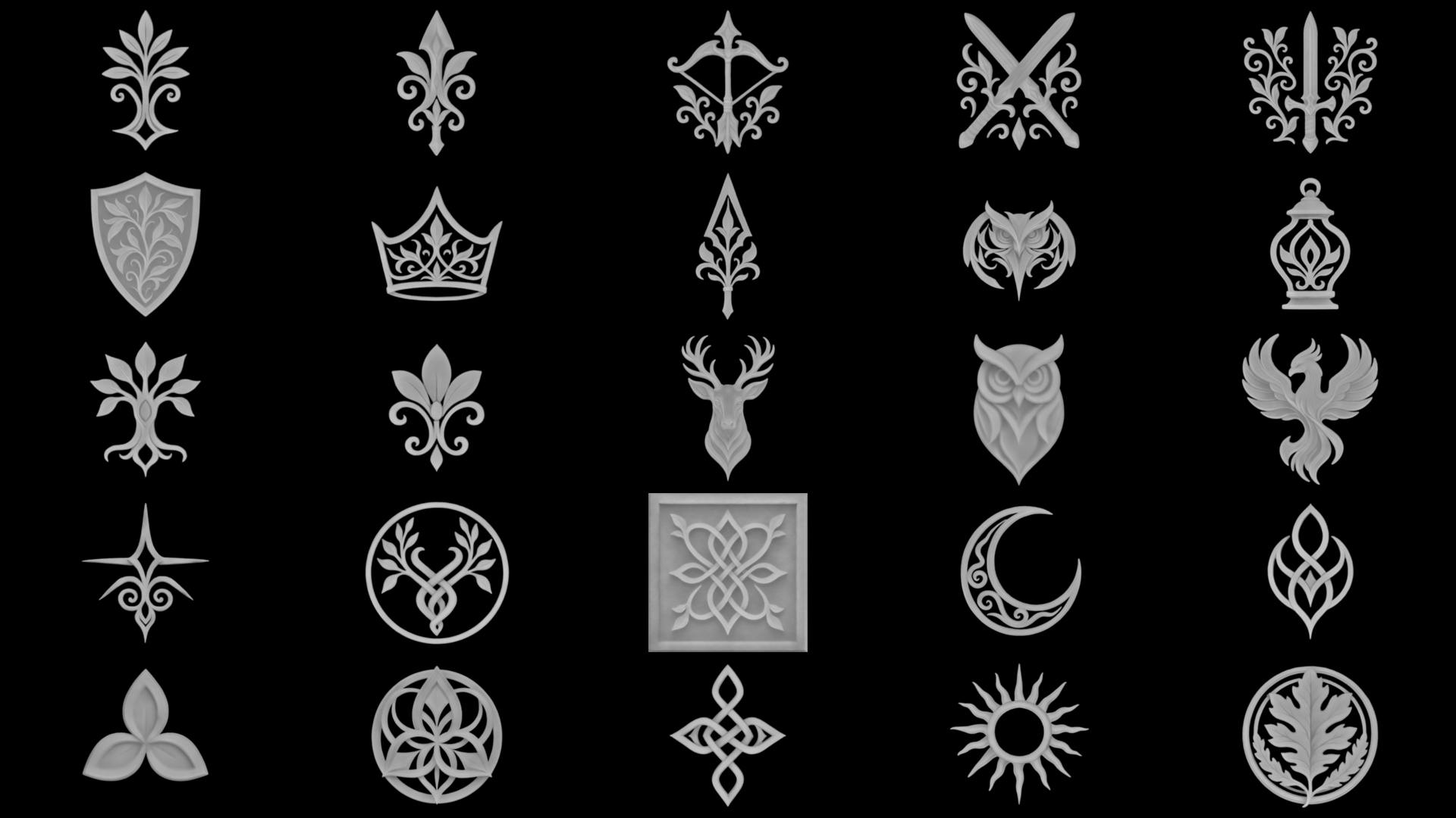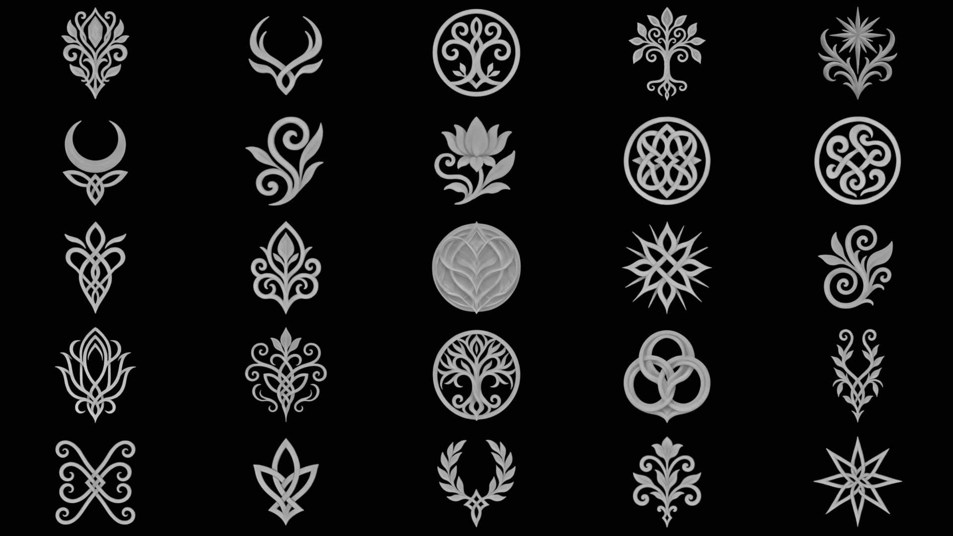 Elegant foliage, flowing crests, knot motifs, ornamental trims, and symbolic emblems — designed to slot straight into fantasy pipelines.