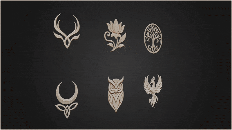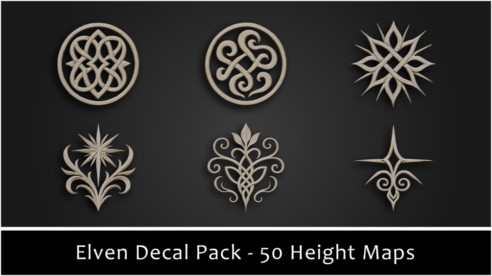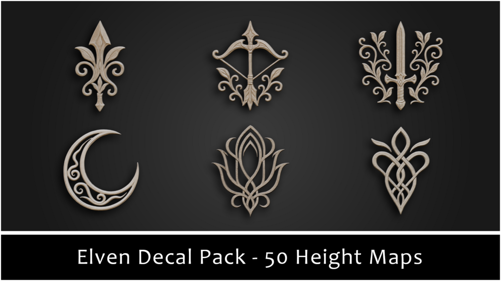 The 3DT Elven Ornamental Decal & Stamp Pack delivers 50 stylized Elven designs — crests, floral emblems, knotwork, trims, symbols, medallions, and ornamental tiles — each supplied with height, color, and mask maps, ready for Blender, Substance Painter, and beyond.