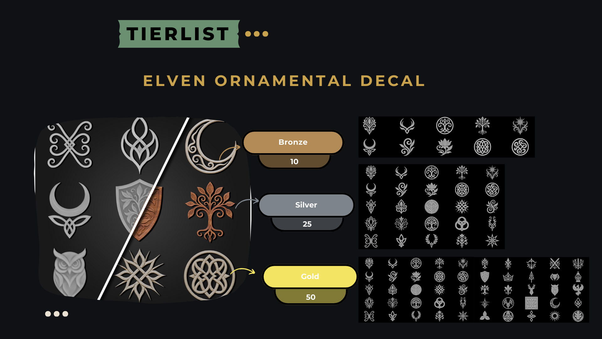 Carve flowing trims into ancient walls, emboss crests into ceremonial weapons, decorate doors and pillars with graceful motifs, or tile ornamental panels across Elven halls.