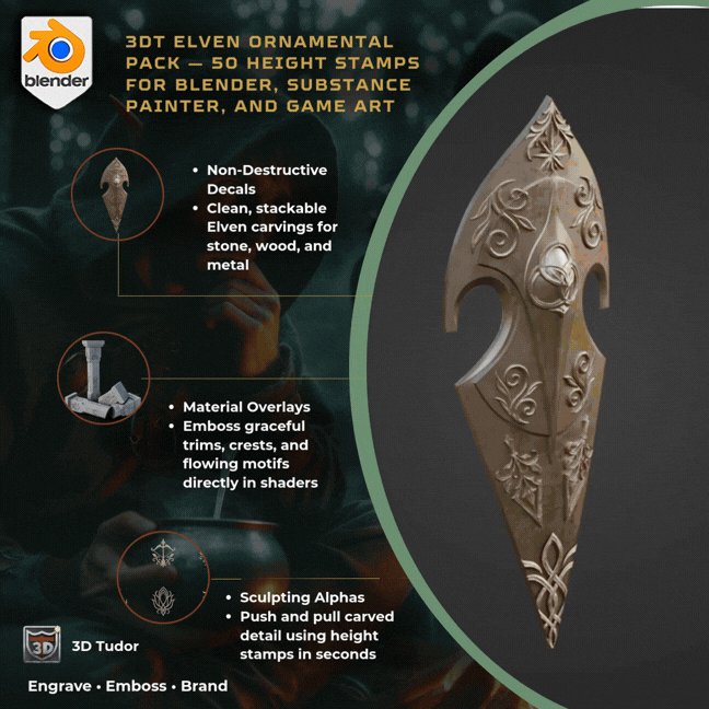 Engrave flowing Elven ornamentation, botanical motifs, and elegant trims into your props in seconds — no retopo, no re-sculpt, just stamp and go in Blender, Substance Painter, and modern game engines.