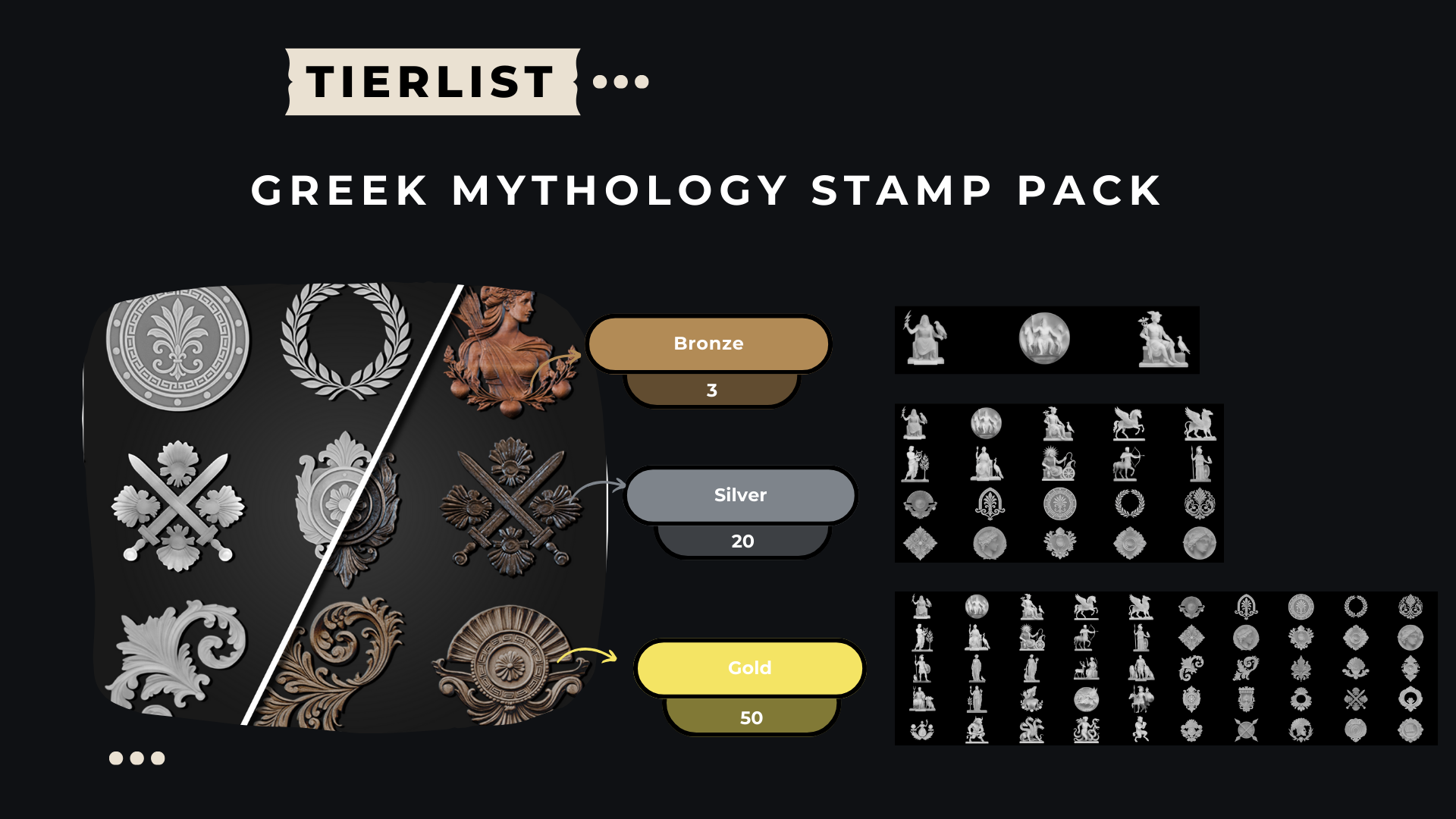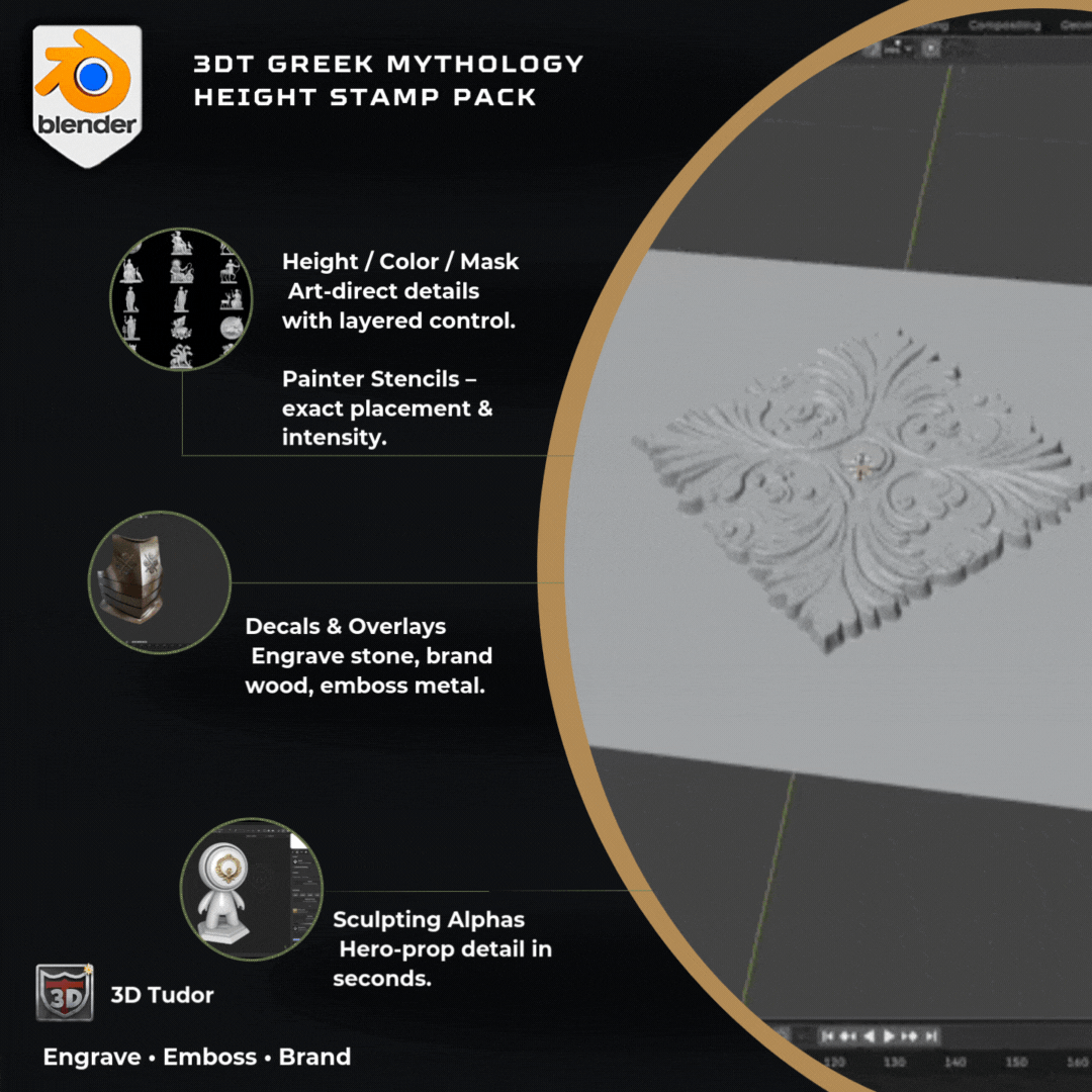 Stamp faster. Look sharper. The 3DT Greek Mythology Height Stamp Pack delivers 50 mythic designs with height, color, and masks for Blender, Substance, and beyond—ideal for decals, sculpting, overlays, and stencils.