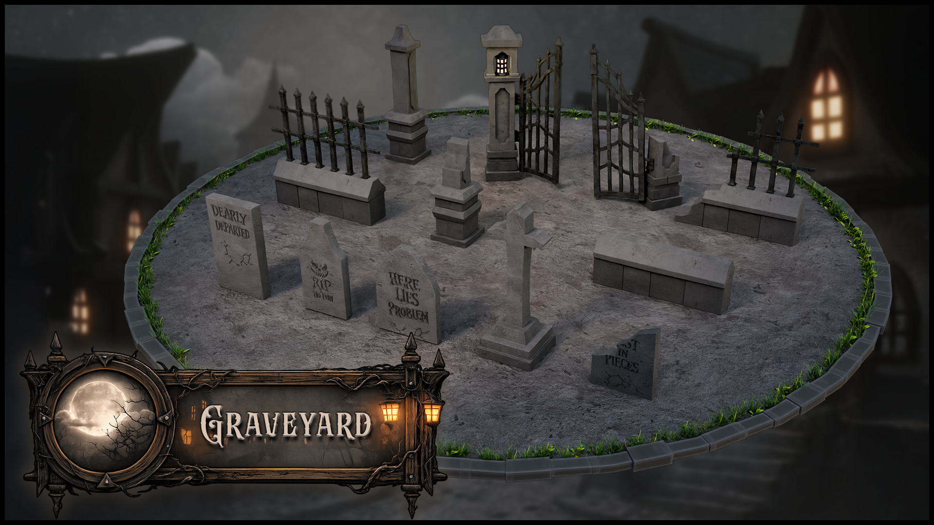 Need a side area that instantly sells the theme? Drop in the cemetery set, throw up a fence line, and you are done.