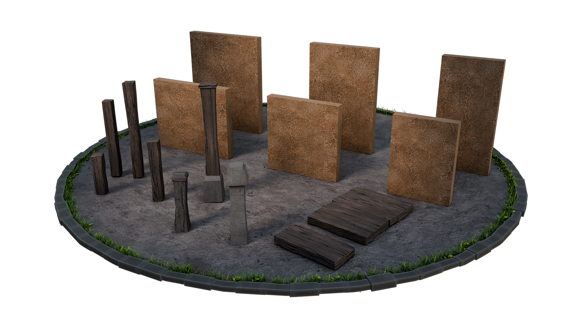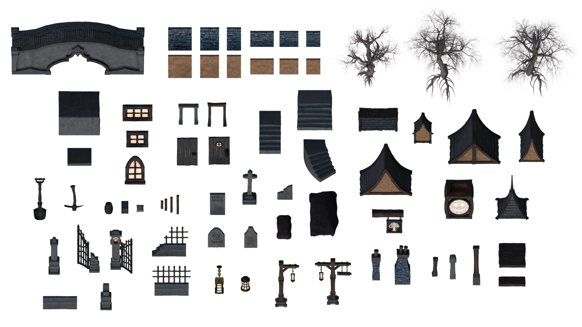 You also get set-dressing props like shovels, pickaxes, grave dirt piles, plus classic clutter like barrels, crates, and sacks.