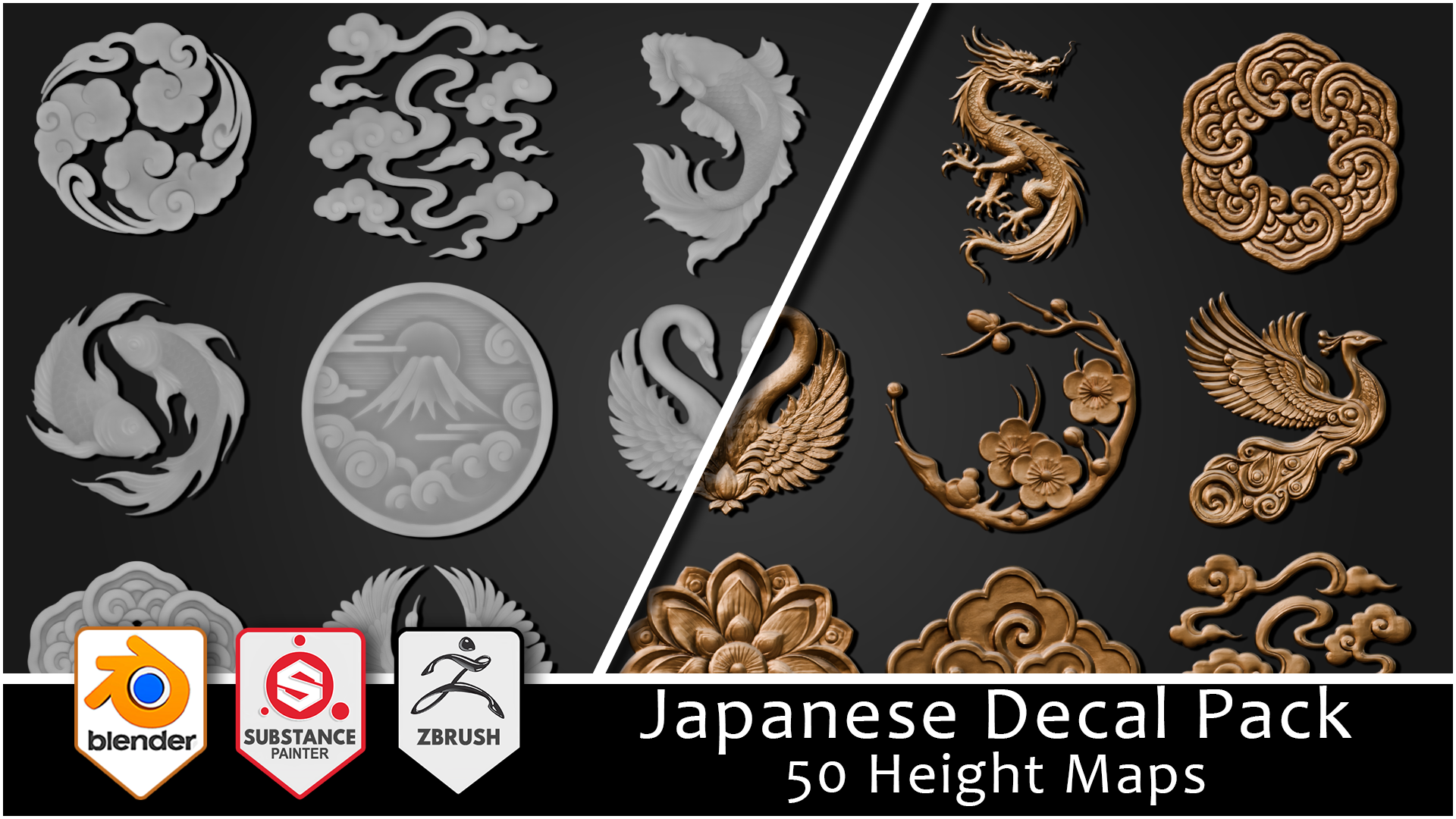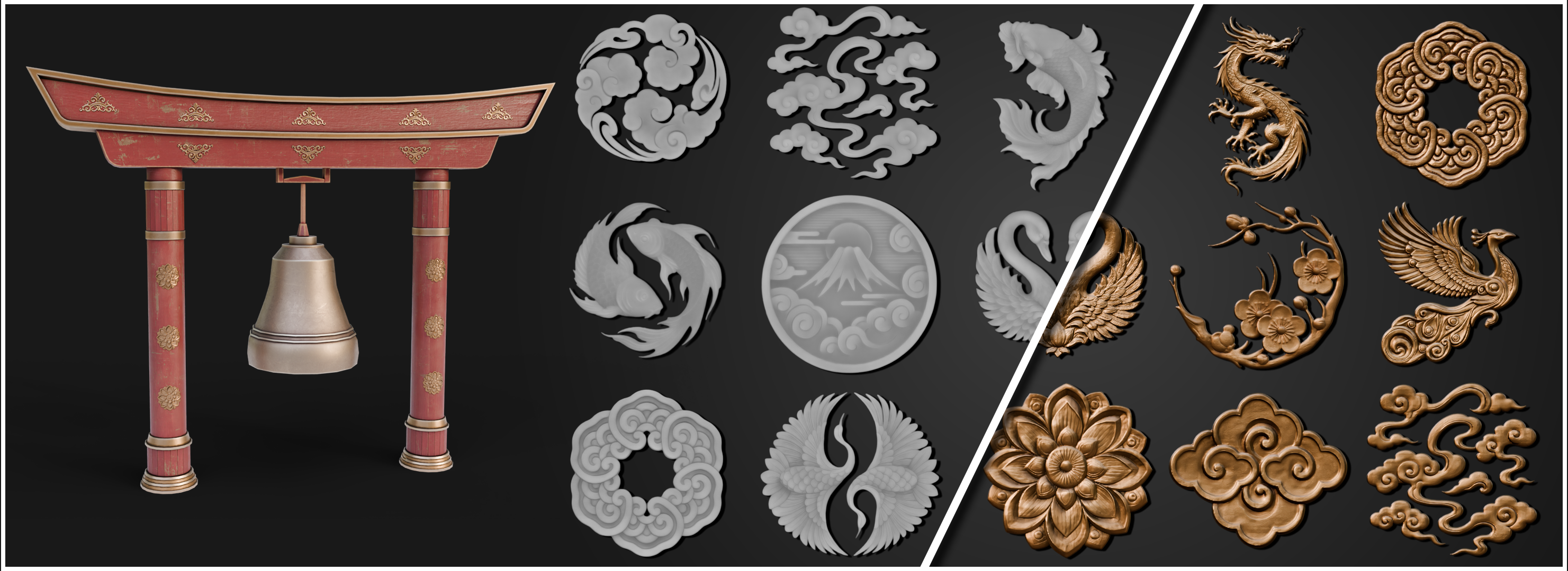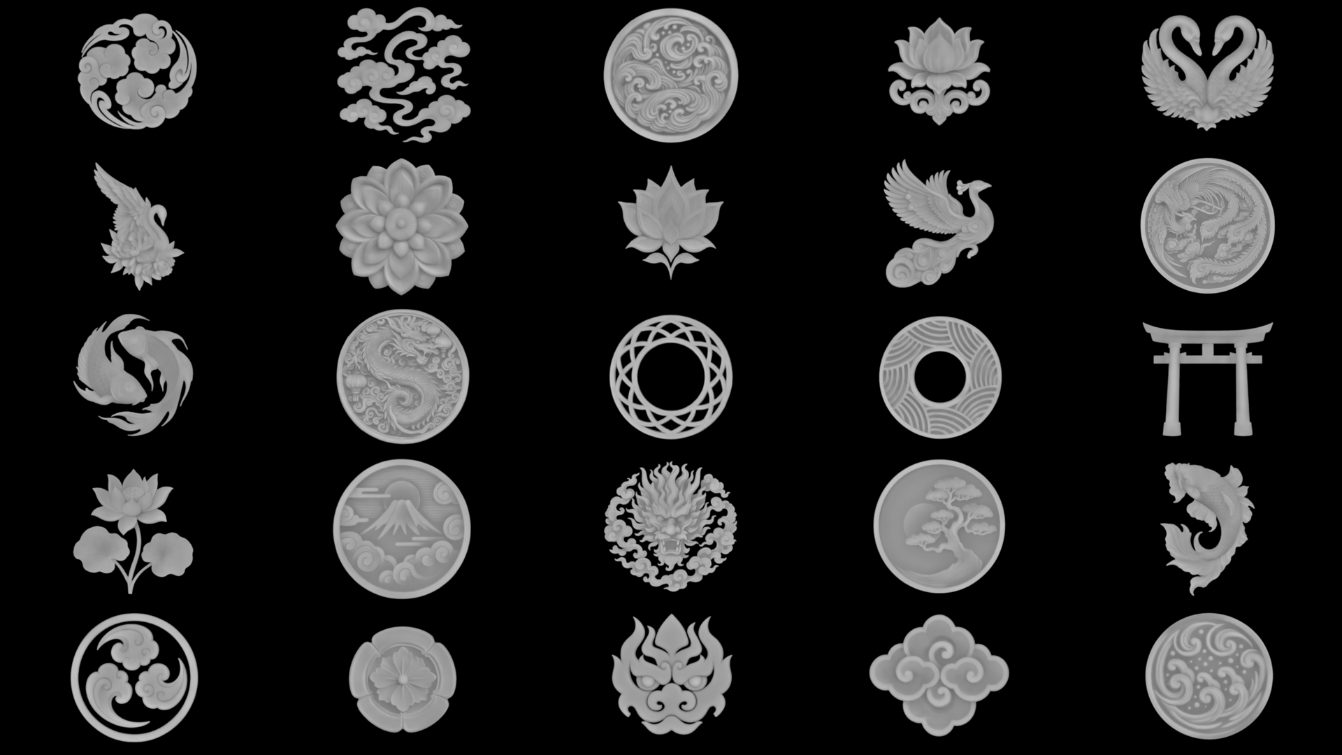 Add stylized Japanese ornament to your props in seconds — crisp crests, swirling clouds, koi, cranes, florals, dragons, and medallions, ready to stamp straight into Blender, Substance Painter, and game-ready pipelines.