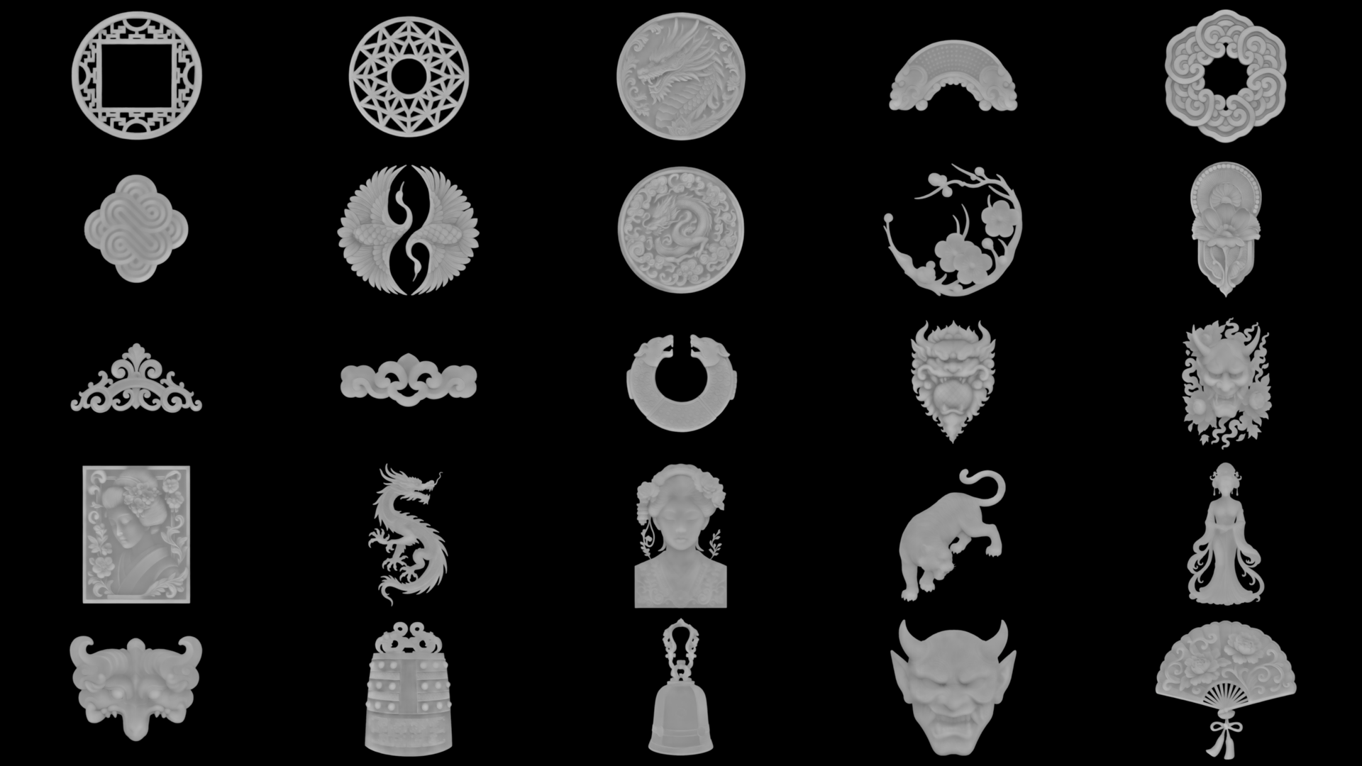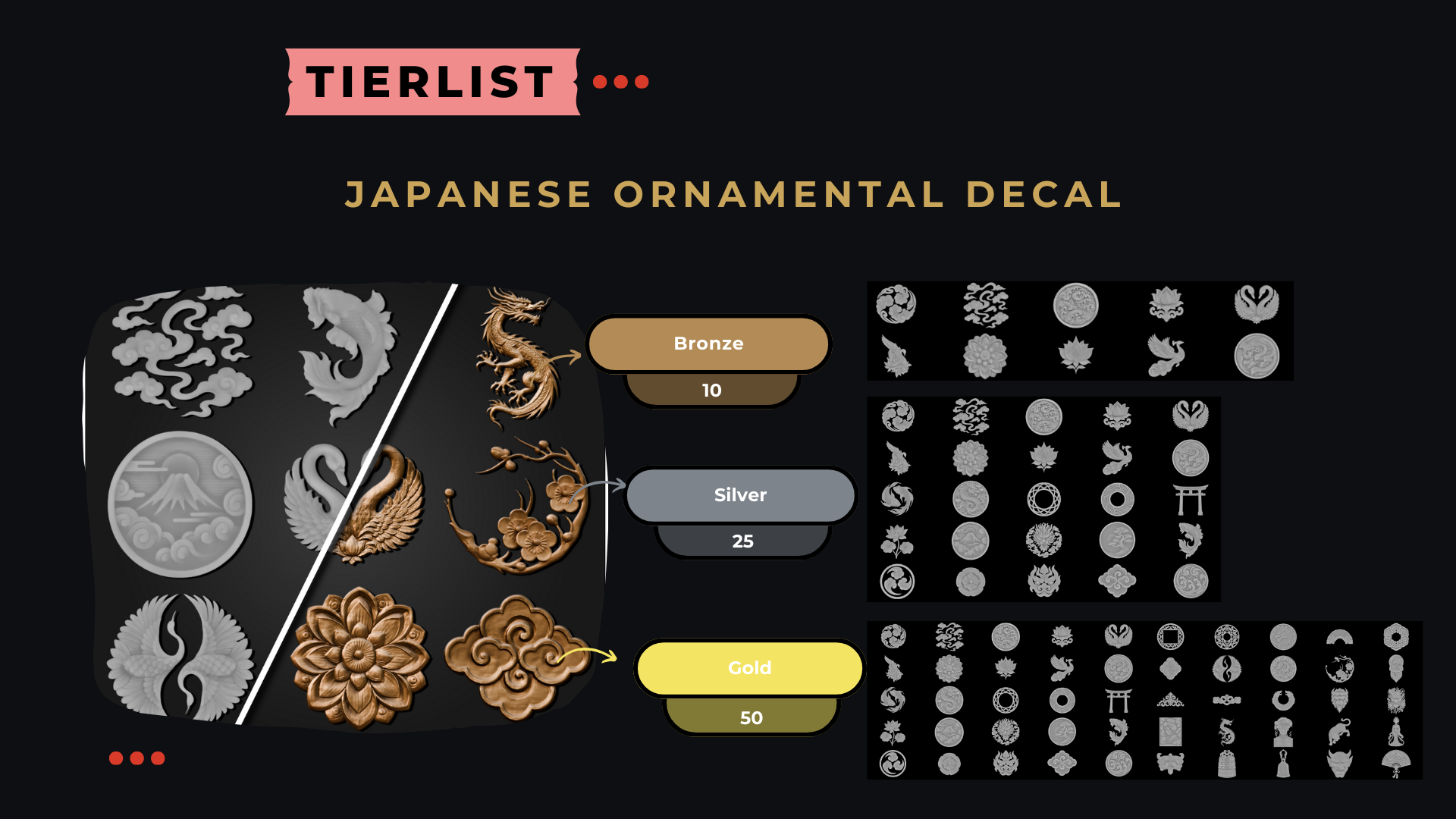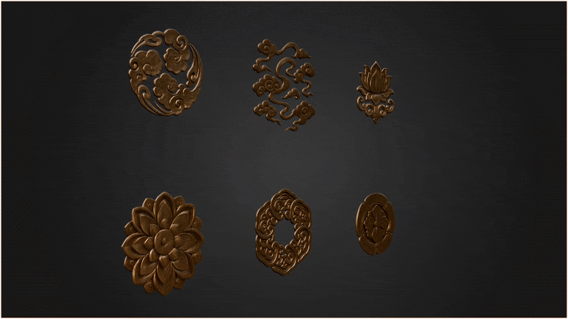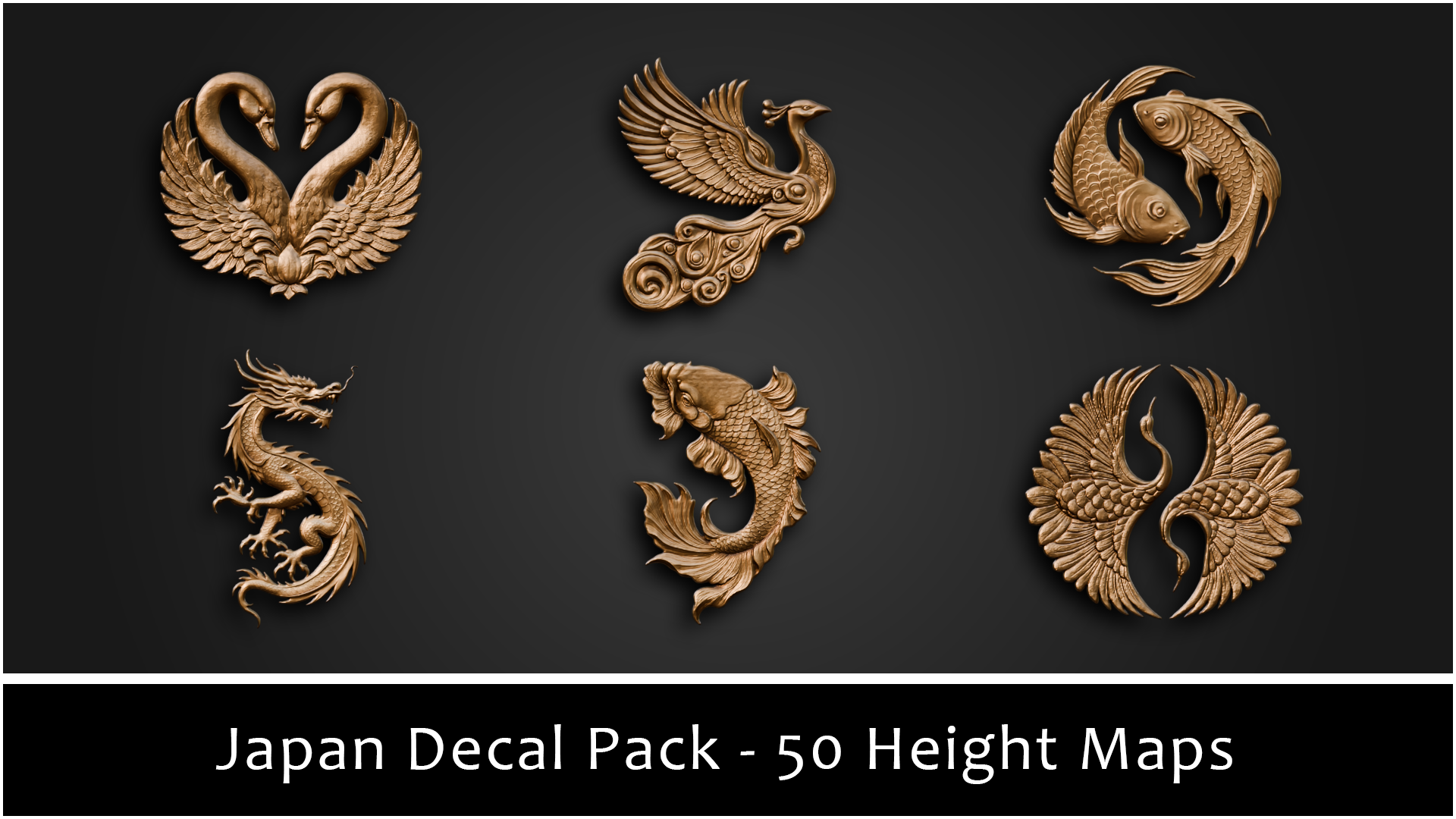 Add stylized Japanese ornament to your props in seconds — crisp crests, swirling clouds, koi, cranes, florals, dragons, and medallions, ready to stamp straight into Blender, Substance Painter, and game-ready pipelines.
