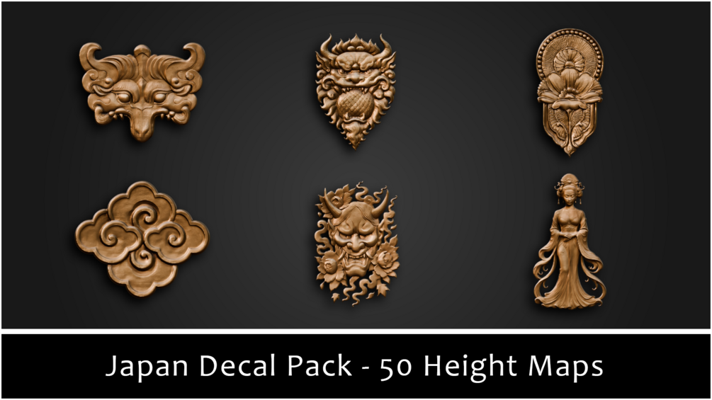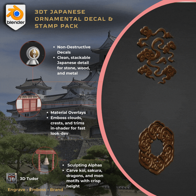 The 3DT Japanese Ornamental Decal & Stamp Pack is built for environment and prop artists who want that refined “carved detail” look without losing days to sculpting, retopo, and endless micro-adjustments.