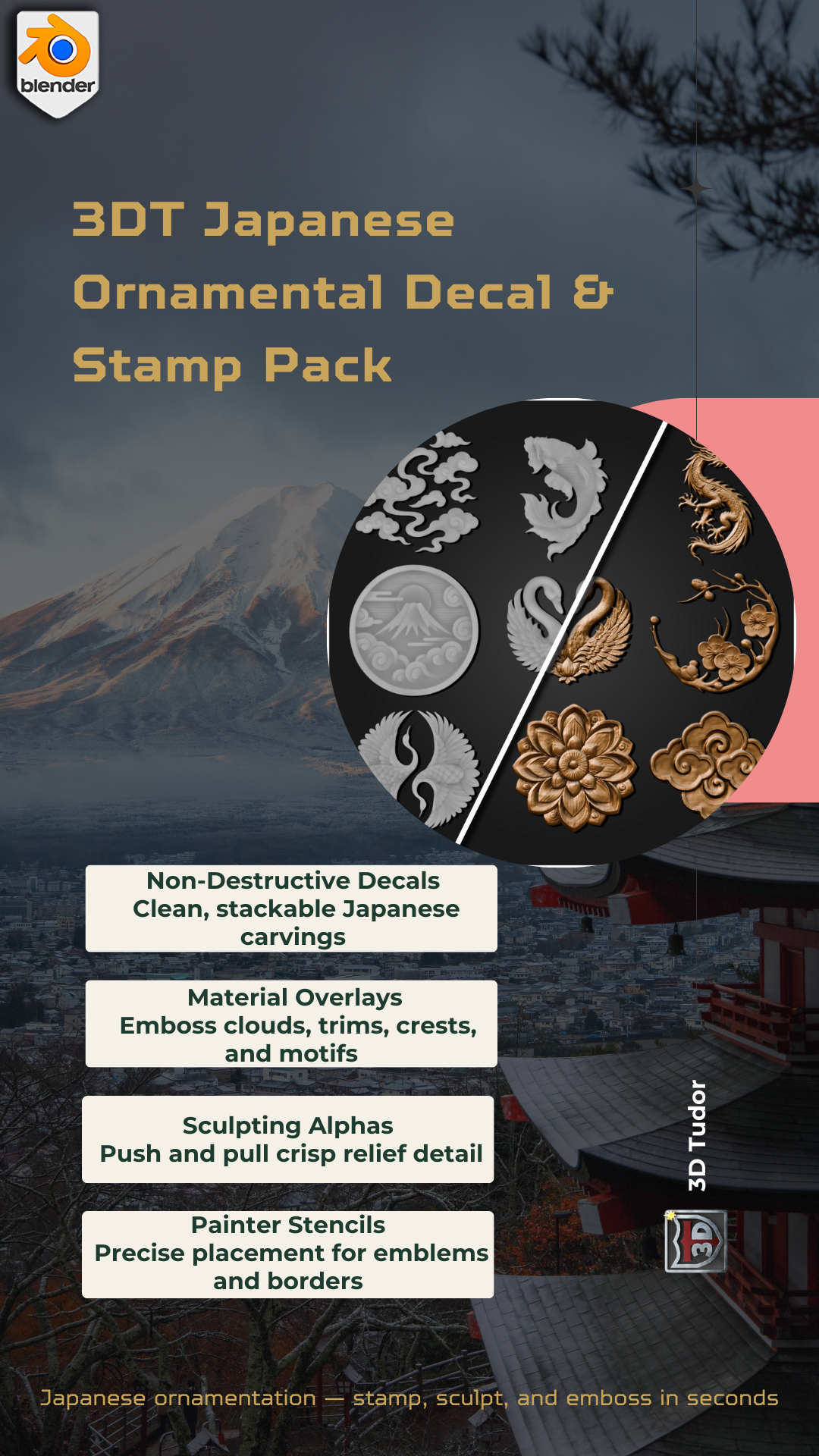 The 3DT Japanese Ornamental Decal & Stamp Pack delivers Japanese-inspired ornament with height, color, and masks, plus a Blender demo file so you can start creating immediately.