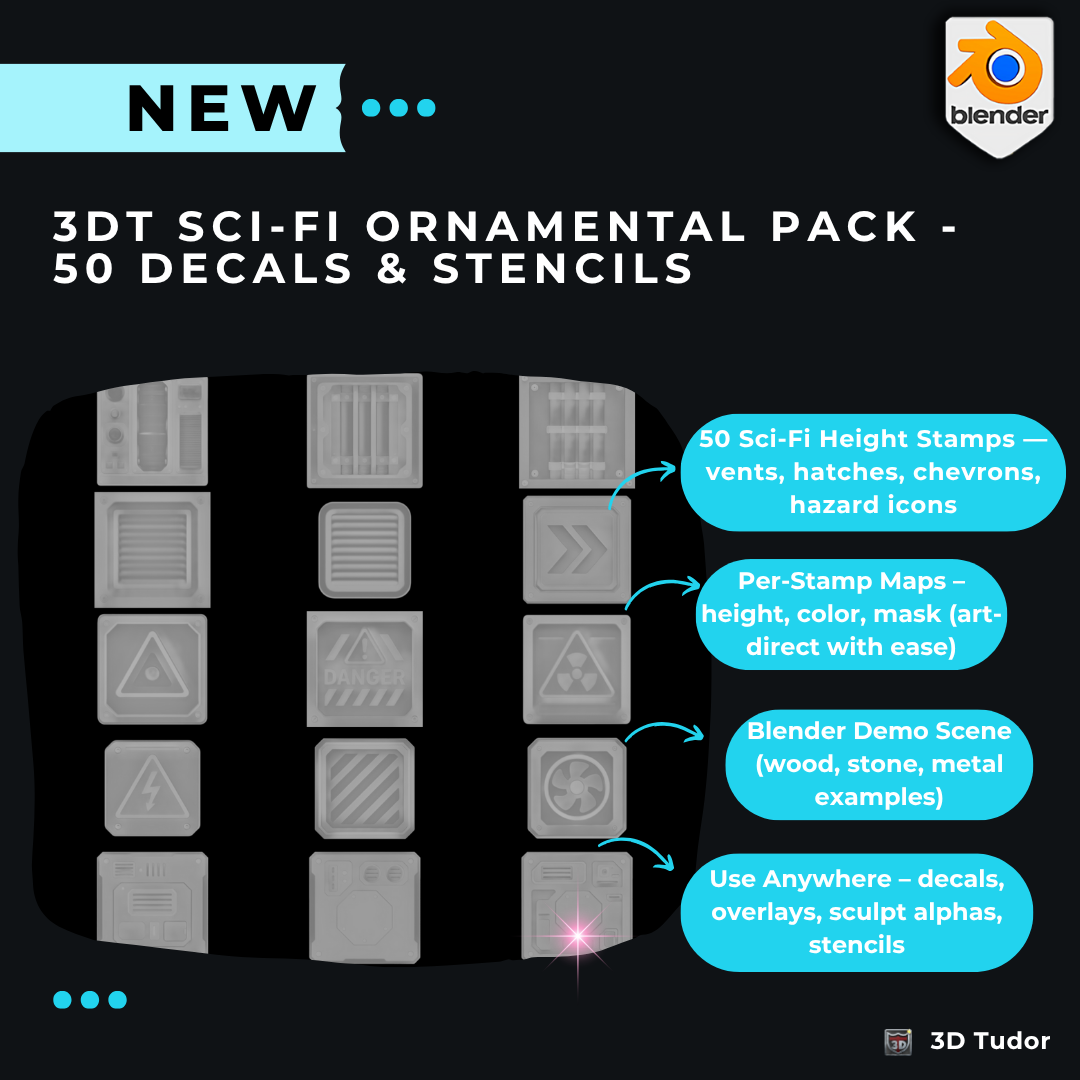 The 3DT Sci-Fi Ornamental Pack delivers 50 production-ready sci-fi designs with height, color, and masks—ideal for decals, sculpting, overlays, and stencils. Includes a Blender demo file so you can create immediately.