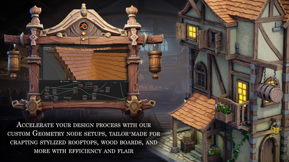 4. Accelerate your design process with our custom Geometry node setups, tailor-made for crafting stylized rooftops, wood boards, and more with efficiency and flair