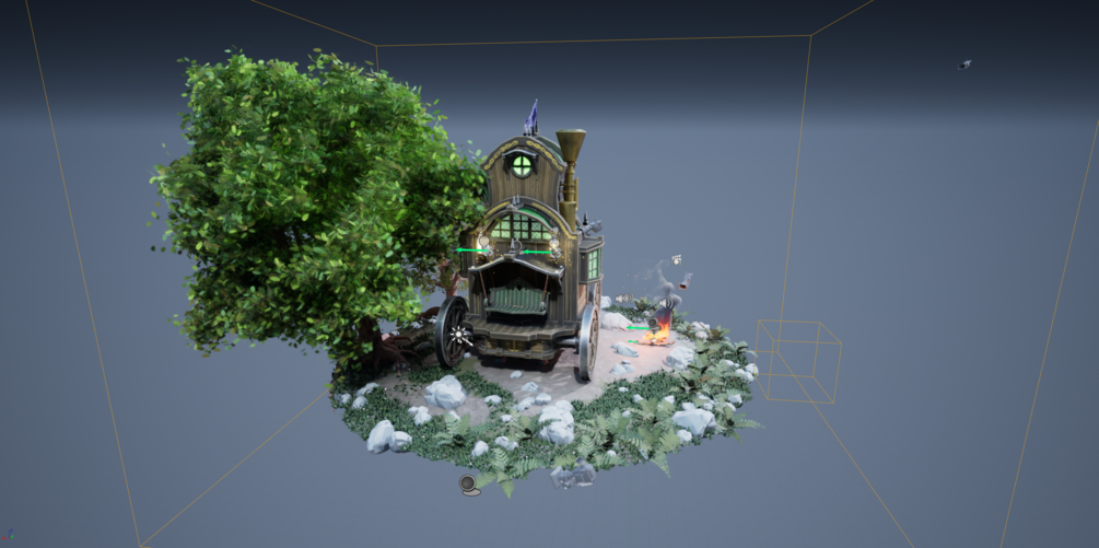 We will be adding particle systems to our scene to add ambiance from simple fireflies hovering around the wagon lamps to more complex particles like fire embers.