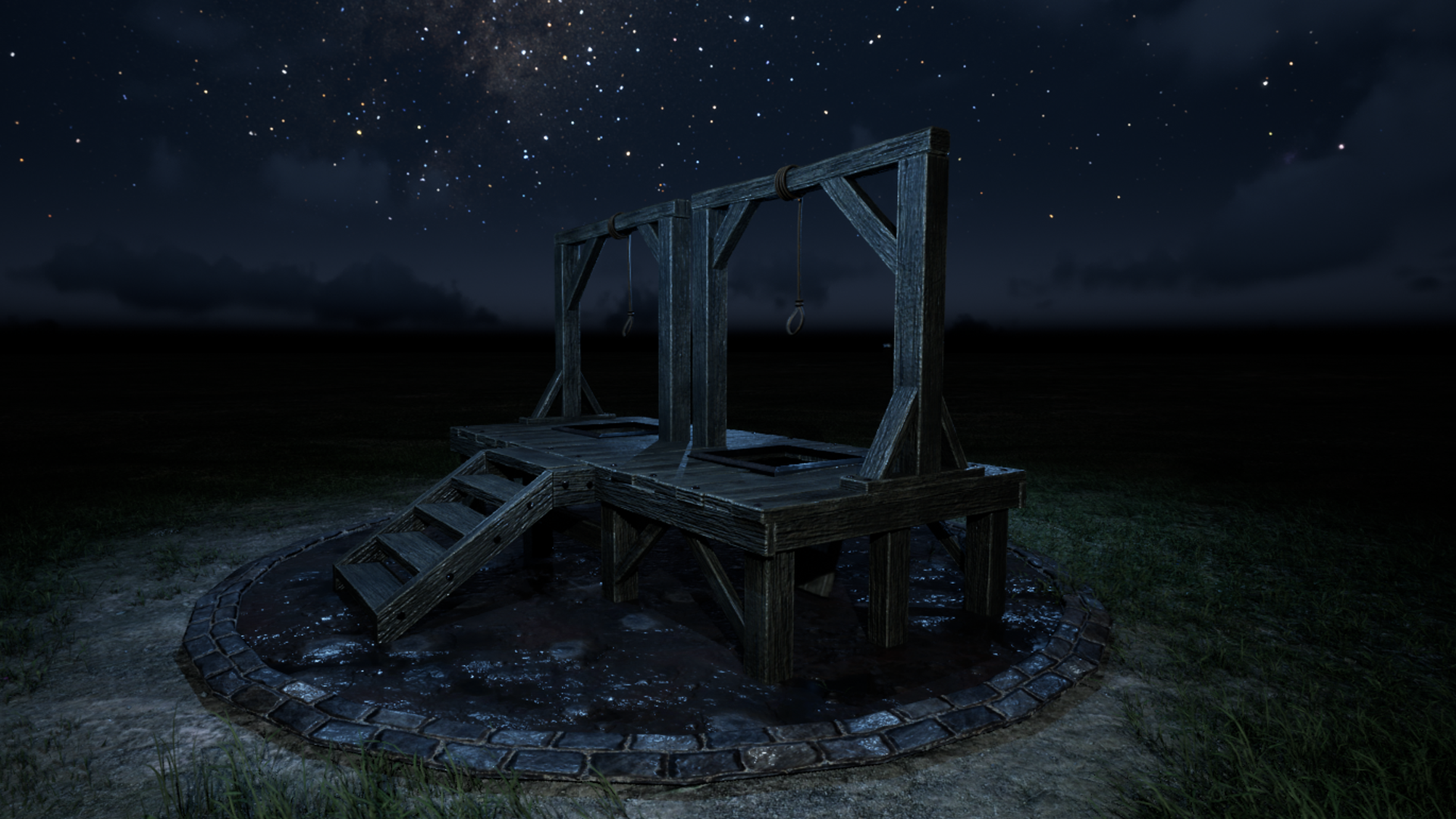 Our 3D modelling focus will be on building a simple wooden structure for our gallows, followed by modelling rope and adding realism to it. We will also be making sure that the floor platform planks are cut the right way so that they can collapse in a believable way when the execution lever is pushed down.