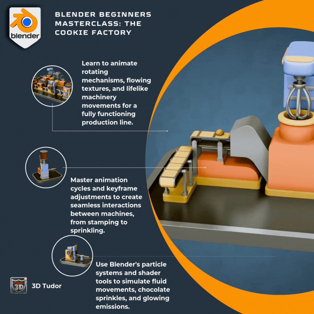 Instead of abstract exercises, you’ll be building real, usable 3D assets for a visually stunning project. By the end, you’ll have a fully animated, professional-quality cookie factory to add to your portfolio.