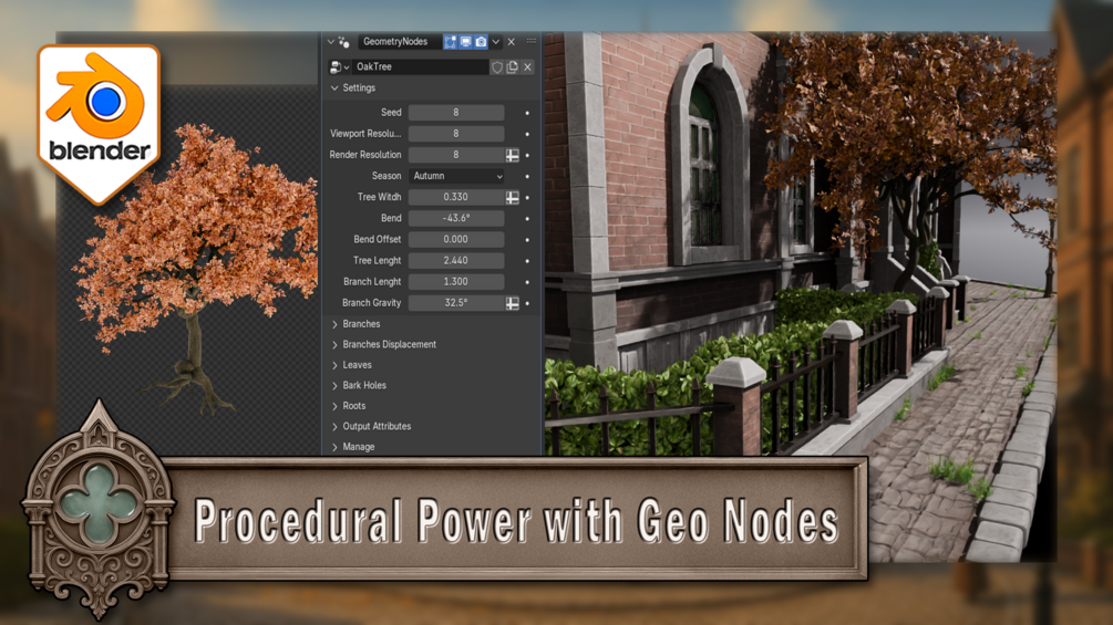 - Using Geometry Nodes for roof tiles, stone paths, and procedural foliage