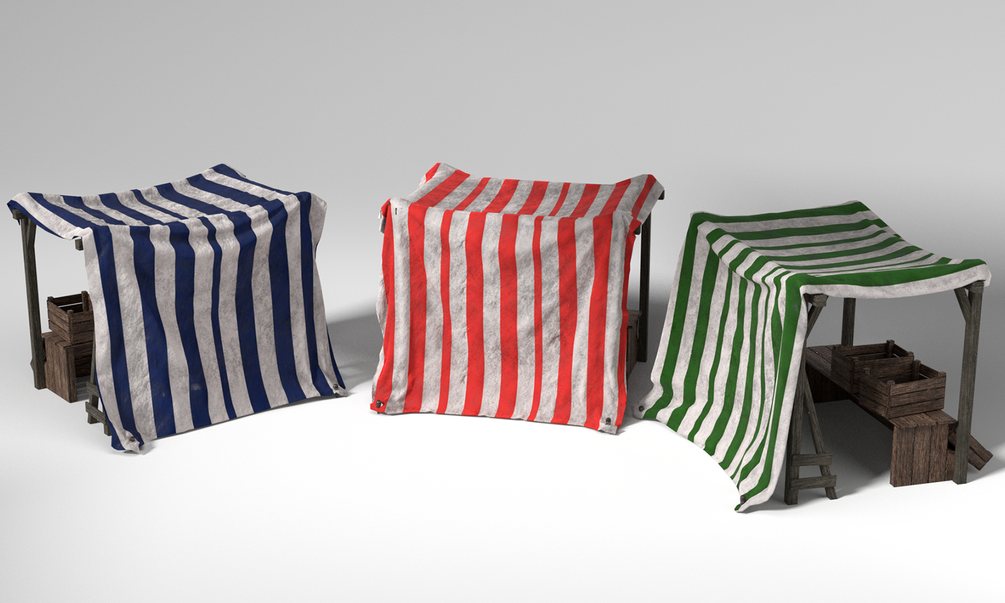 Here is a set of high-quality Medieval Market stalls with accompanying crates. All models feature a realistic cloth with three different color variations, which are textured to look weathered and slightly worn so as to add to the authenticity. A lot of time was put into the cloth, using a cloth simulator to look as realistic as possible. The medieval market stall is UV unwrapped onto one set of maps for each stall for optimization. All parts of the stalls are full PBR textures and were created especially for these stalls using Photoshop, and Crazy Bump.