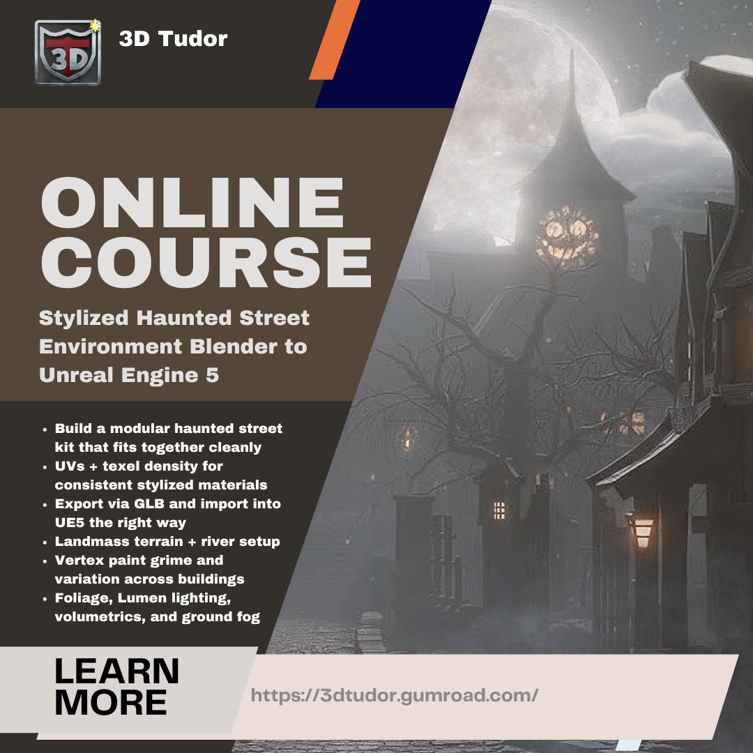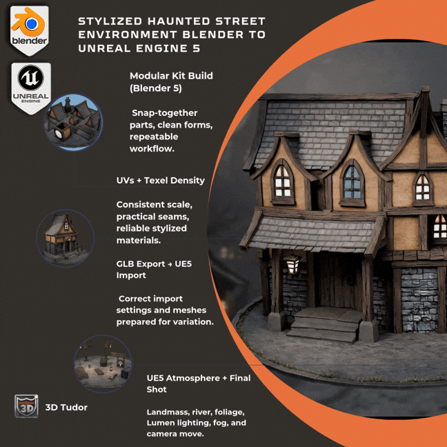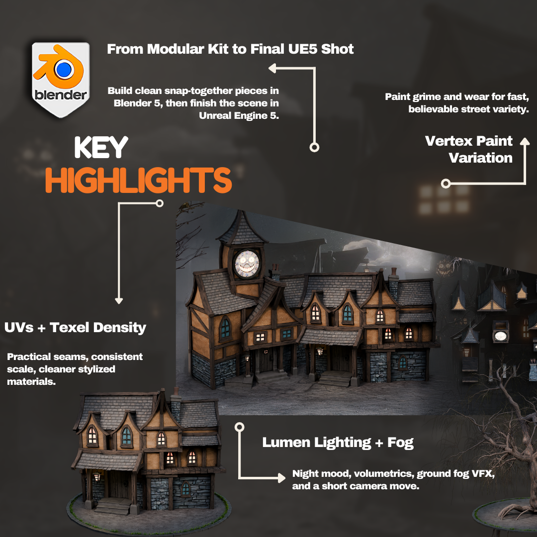 In Blender to Unreal Engine 5: Stylized Haunted Street Modular Kit, you will build a proper modular kit in Blender, then finish the environment inside Unreal Engine 5 — terrain, river, foliage, mood lighting, fog, and a final establishing shot.