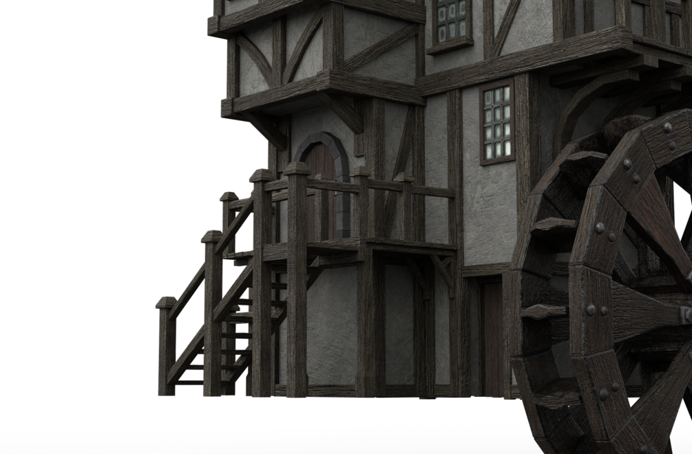 Our 3D modelling focus will be on creating realistic and fully functional subcomponents for our windmill. This will include an intricate set of wooden supports, balconies, stairs, a water wheel, and windmill arms.