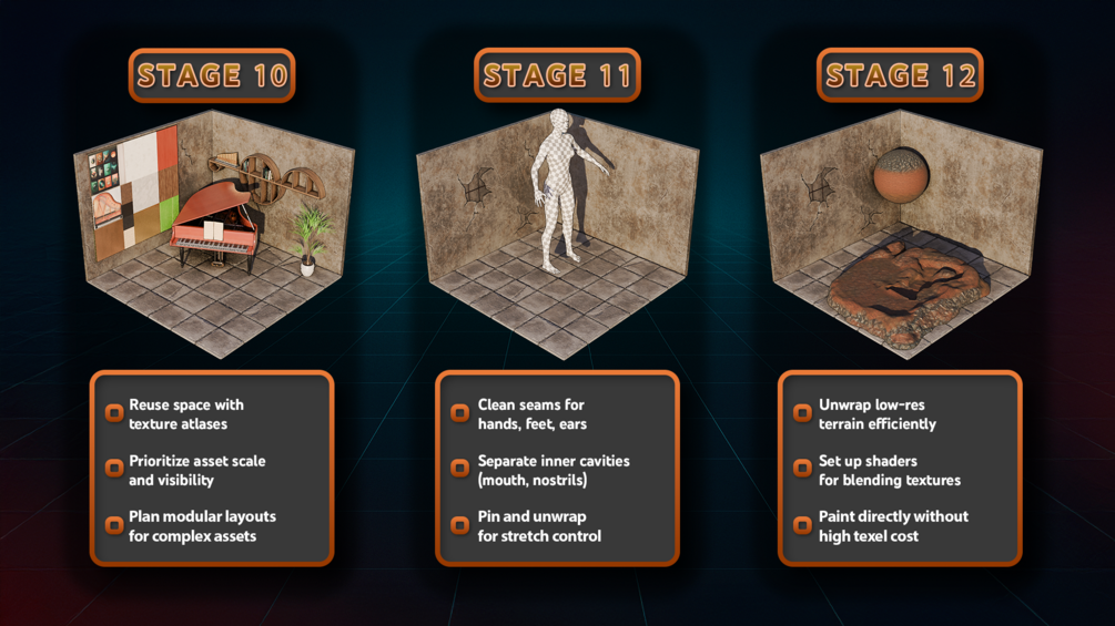 This stage focuses on clean geometry and solid workflows. You will learn to apply transforms, fix flipped normals, avoid mipmap bleed, and handle overlapping UVs. We also introduce Blender and Substance tools for visualising distortion, and explore padding’s role in texture clarity across engines.